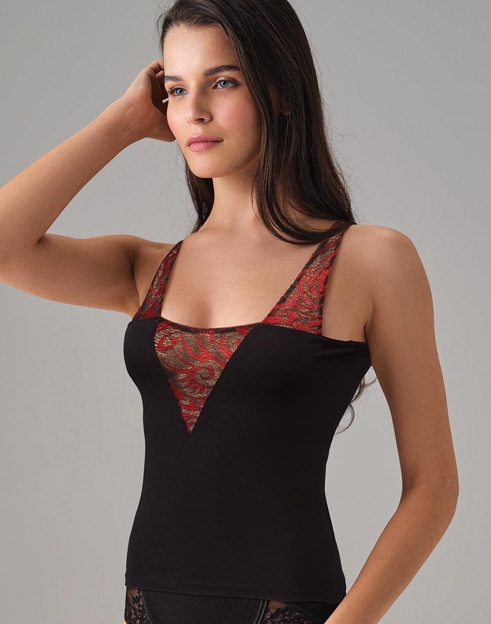Somon renginde, ince tül dokusuyla tasarlanmış askılı kadın atlet, zarif kesimiyle dikkat çekiyor.