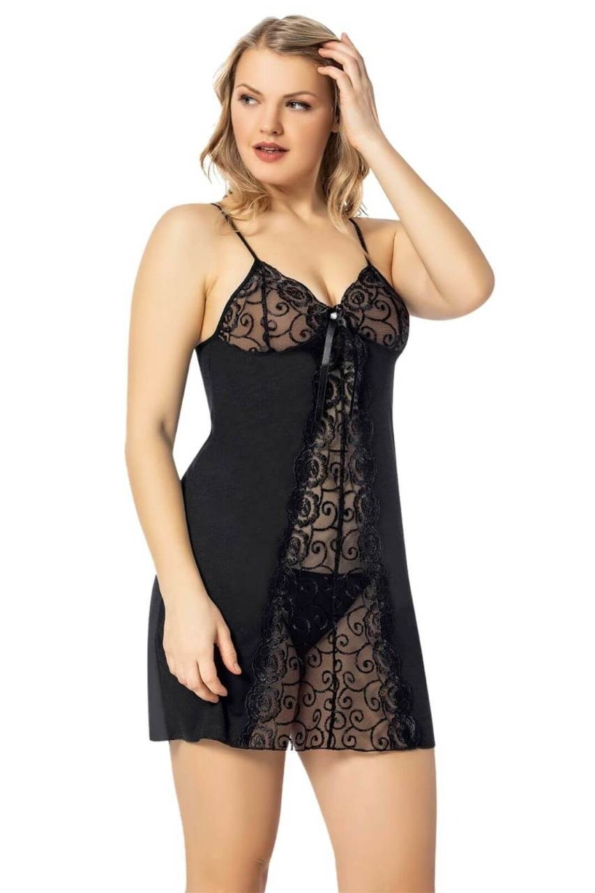 Siyah renk seçenekleriyle, transparan üst detayı ve dantel dikişleriyle zarif bir görünüm sunar.