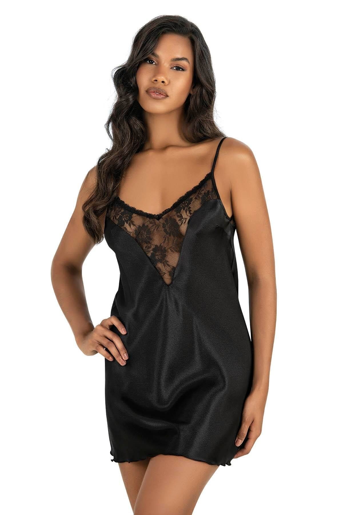 Siyah kısa saten gecelik, şıklığı ve zarafeti bir araya getiriyor. Saten kumaşı sayesinde hafif ve pürüzsüz bir dokunuş sunarak, gece giyiminiz için mükemmel bir seçenek oluşturuyor. Tül detaylı yakası, geceliğe zarif bir hava katarken, vücut hatlarınızı da nazik bir şekilde sarıyor.