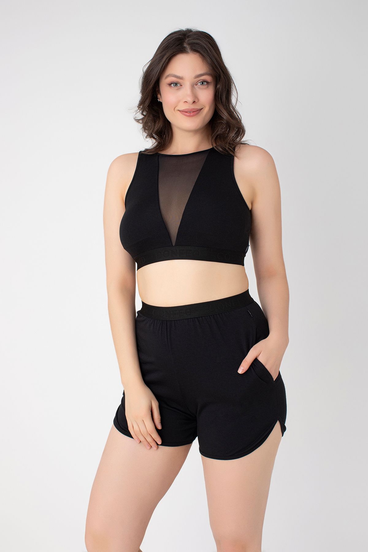 Siyah tüllü detaylı, dar kesim modal büstiyer, rahat bir görünüm sunan V yaka tasarımıyla dikkat çekiyor. %45 Modal, %45 Cotton, %10 Elastane