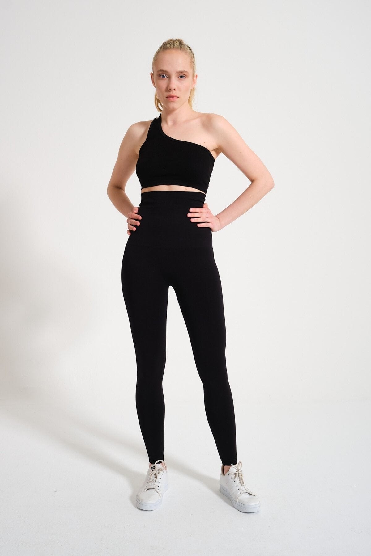 Somon renginde, dikişsiz tasarıma sahip ultra yüksek bel korse tayt, karın ve bel bölgesini toparlayarak daha düz bir görünüm sağlar.