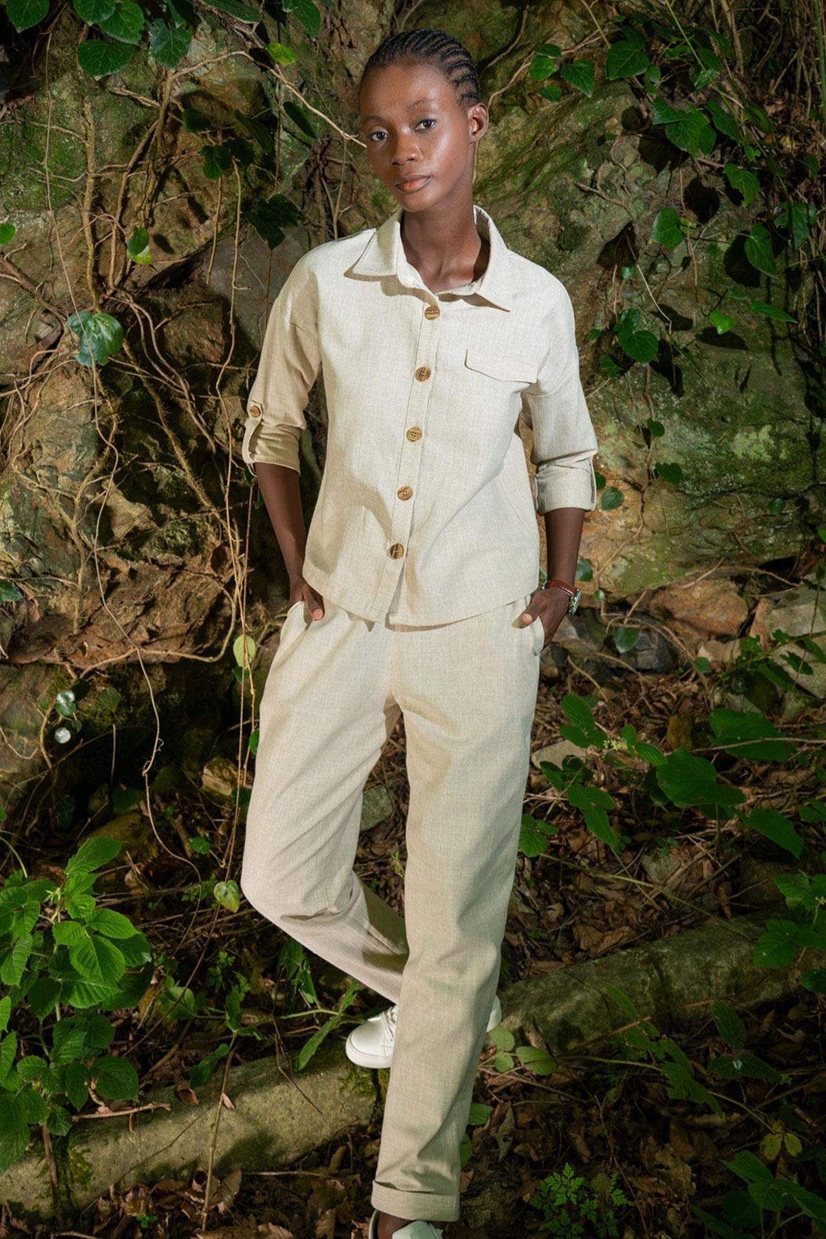 Bej renginde, düğmeli gömlek yaka tasarımına sahip uzun kollu pijama takımı. Rahat kesimi ve yumuşak kumaşı ile konfor sağlıyor.