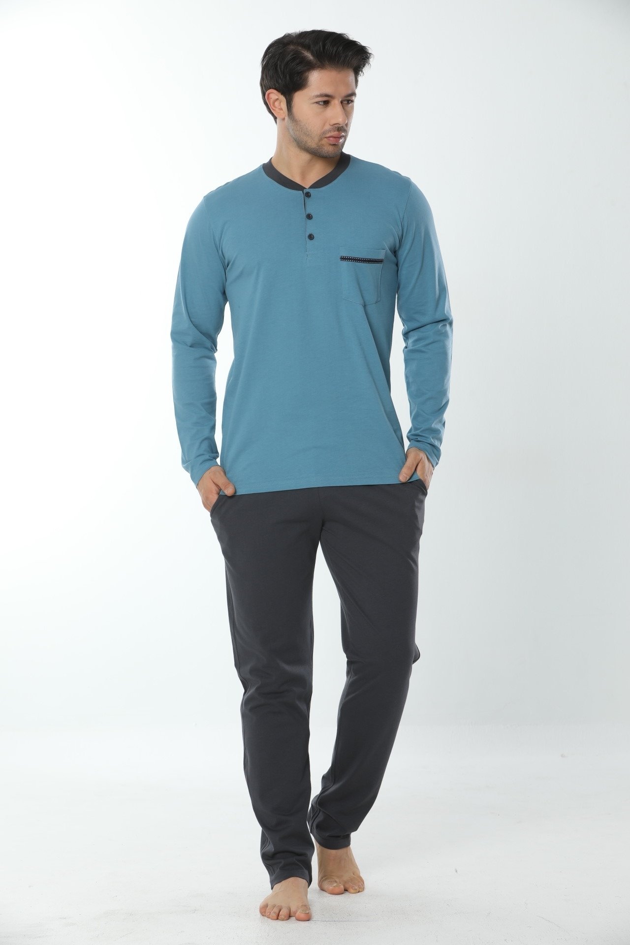 Uzun kollu mavi lacivert erkek pijama takımı, evde geçirdiğiniz zamanları daha konforlu hale getiriyor. Yumuşak pamuklu kumaşı sayesinde, bu takım hem rahat bir uyku sağlar hem de ev giyimi için şık bir tercih olur. Özellikle serin havalarda, uzun kollu tasarımı ile vücut ısınızı koruyarak, uyku sırasında konforunuzu artırır. Mavi ve lacivert tonlarının birleşimi, her erkeğin gardırobunda bulunması gereken bir estetik sunar.