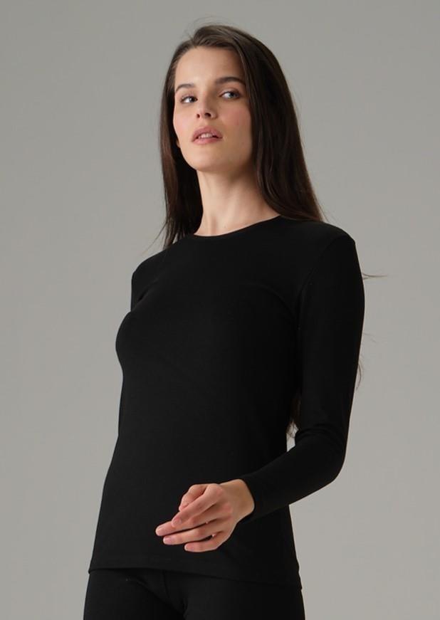 Somon renginde, uzun kollu ve termal yapısıyla sıcak tutan bir kadın T-shirt.