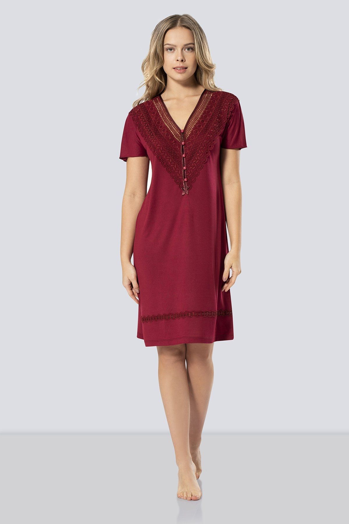 Bordo renginde, V yaka kesimli ve hafif dokuya sahip zarif gecelik.