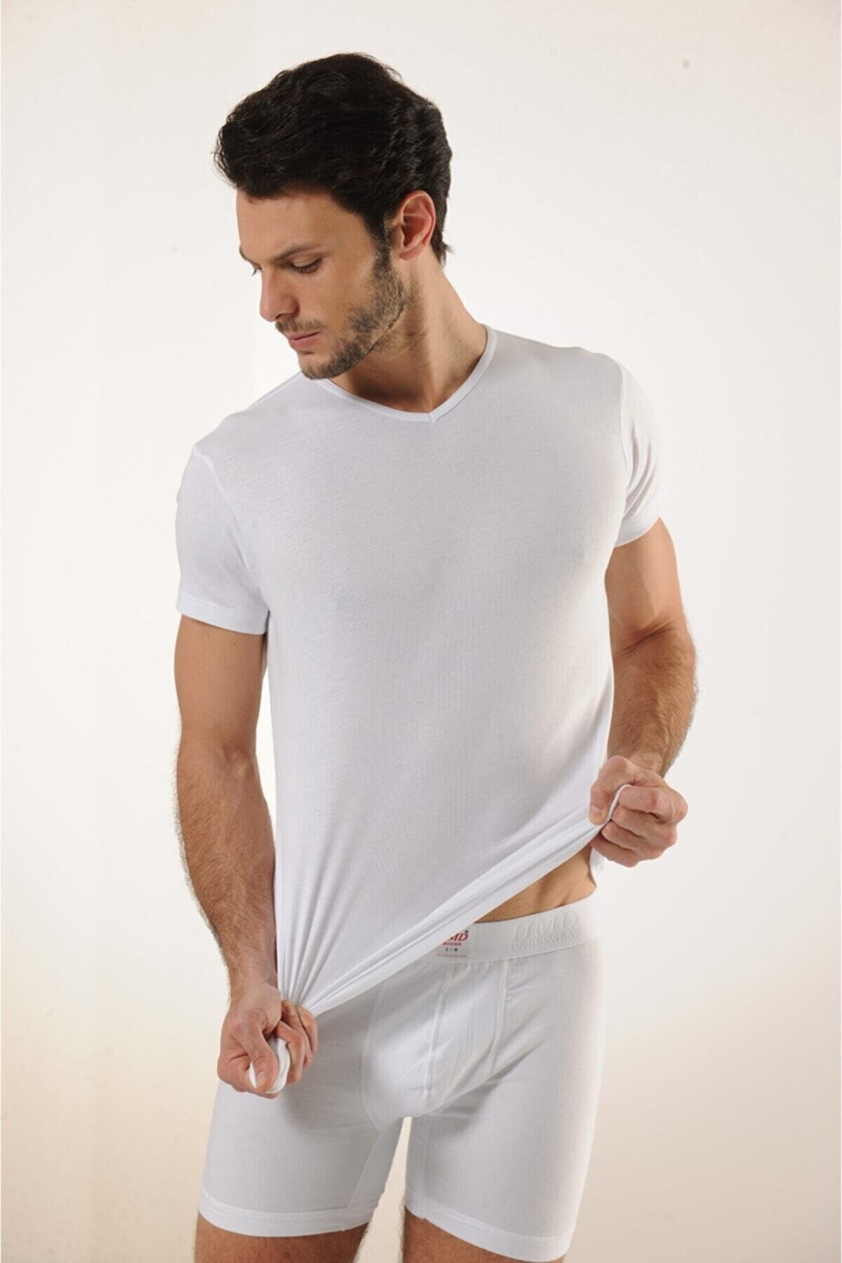 Beyaz renkte, ribana dokusuna sahip V yaka erkek atlet, hafif ve esnek bir yapıya sahiptir. %100 Koton