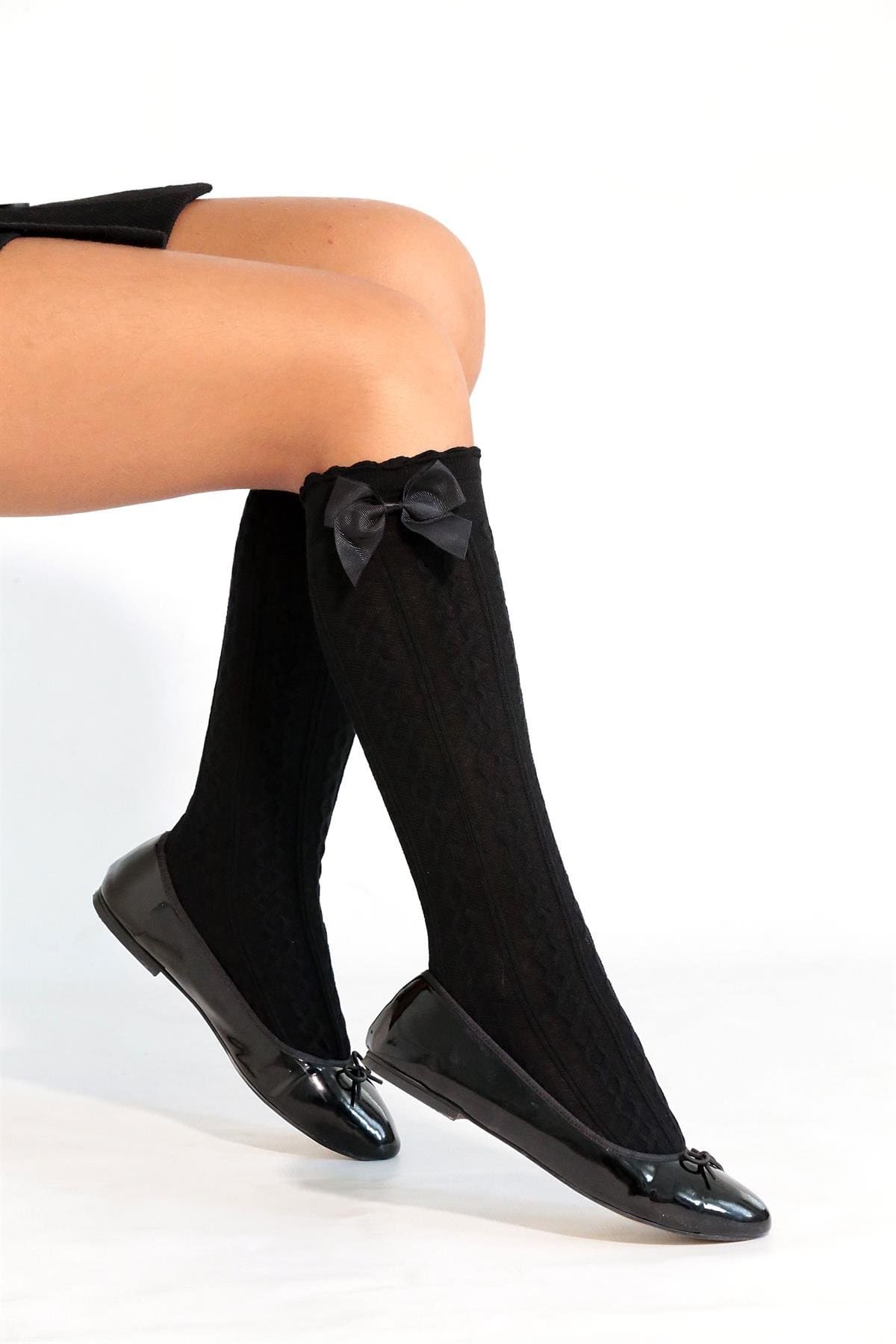 Siyah renkte, fiyonklu ve yumuşak dokuya sahip dizaltı çorap, günlük kullanıma uygun bir tasarım sunuyor. %70 Viskon, %27 Polyester, %3 Elastane