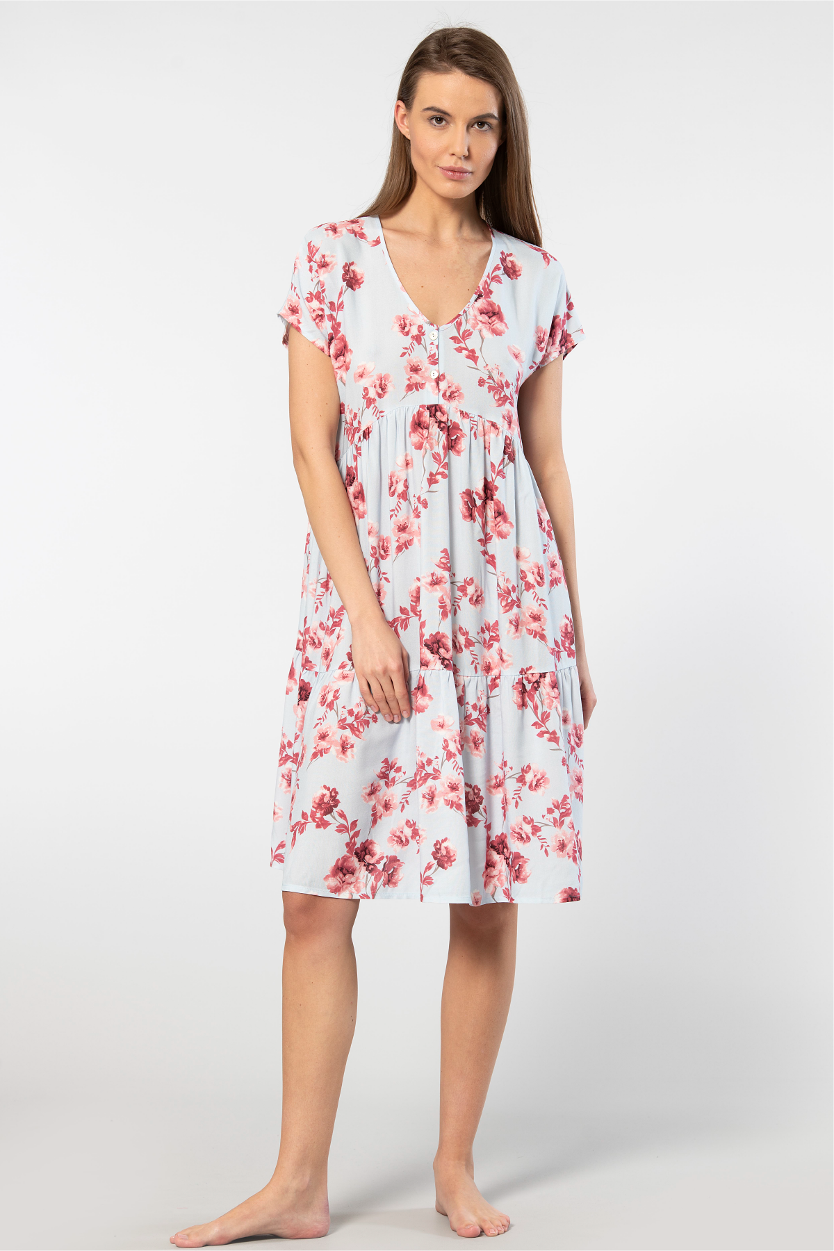 Viskon kumaş kullanılarak üretilen bu kısa kollu elbise, hafif yapısıyla yaz aylarında rahat bir kullanım sunuyor. Viskon, doğal bir lif olduğu için cilde dost bir dokunuşa sahip olup, gün boyu konfor sağlıyor. Ürünün önden düğmeli tasarımı, hem şıklığı artırıyor hem de giyerken pratiklik sağlıyor. Düğmeler, elbisenin genel estetiğine uyum sağlarken, aynı zamanda stilinize farklı bir hava katıyor.