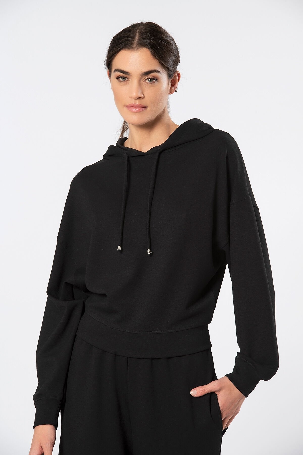 Siyah kapüşonlu eşofman takımı, gündelik yaşamda şıklığı ve konforu bir araya getiriyor. Yüksek kaliteli viskon ve polyester karışımı, bu ürünün hafif yapısını sağlarken, elastan eklenmesi ile hareket özgürlüğü sunuyor. Kumaşın dokusu yumuşak ve hafif olması, onu günlük kullanım için ideal kılıyor. Özellikle evde ya da spor yaparken rahatlıkla tercih edebileceğiniz bir parça olarak öne çıkıyor.