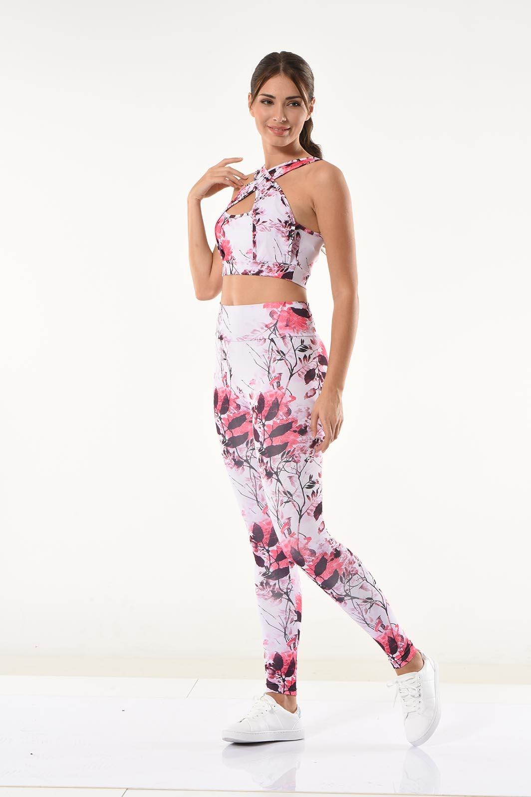 Çiçek desenli tasarımıyla dikkat çeken bu tayt takımı, esnek dokusu ve yüksek bel yapısıyla konfor sunuyor.