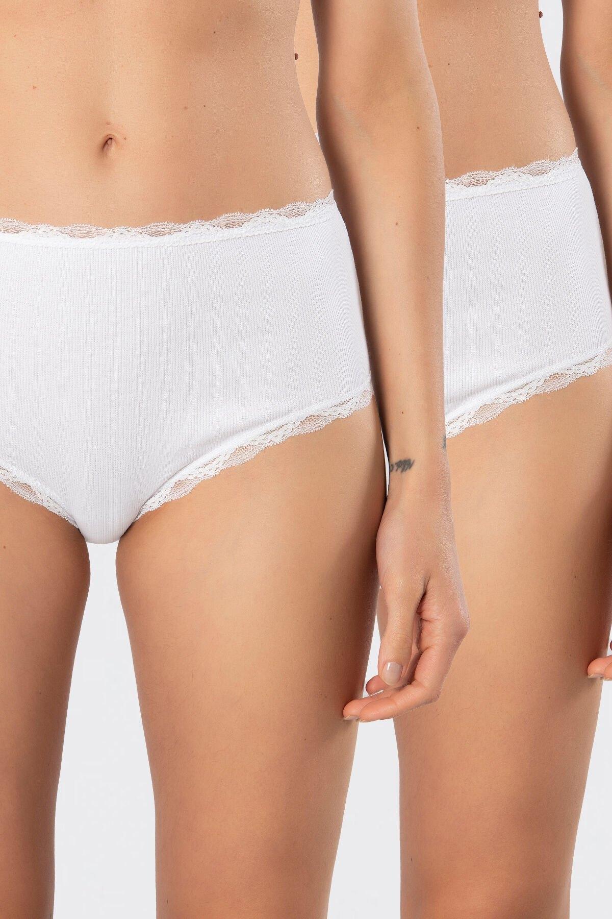 Beyaz renkli, yüksek bel dantelli ribana külot, esnek pamuk kumaşıyla konfor sunar. %95 Pamuk, %5 Elastan