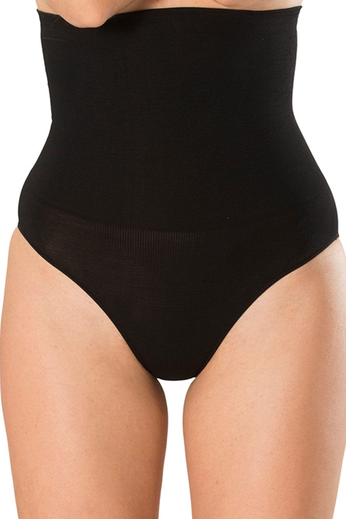 Siyah dikişsiz yüksek bel korse, bel ve karın bölgesinde şekillendirme sağlamak için tasarlanmıştır.