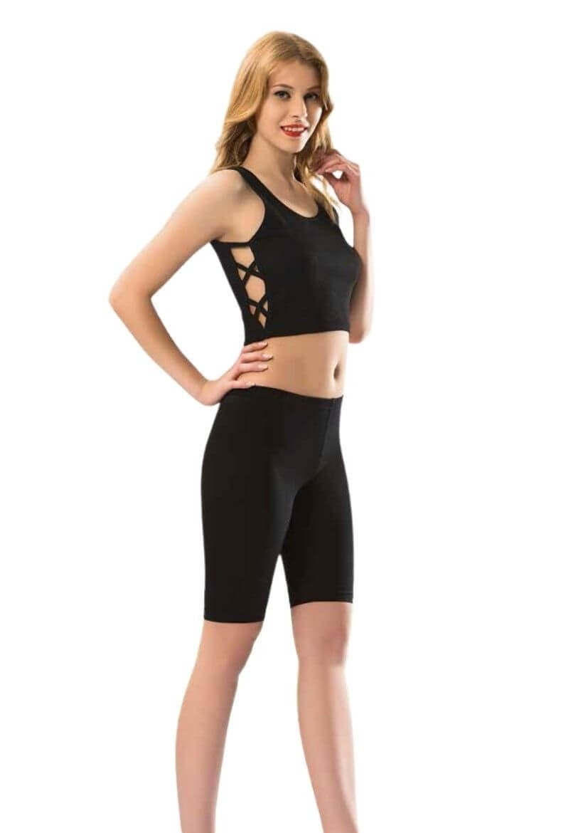 Siyah renkte, diz üstü uzunlukta, esnek kumaş yapısına sahip düz tayt.