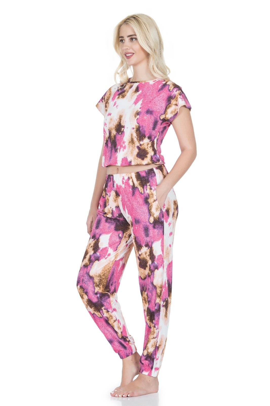 Çok renkli, yüksek bel kesime sahip, yumuşak dokulu desenli tayt takımı.
