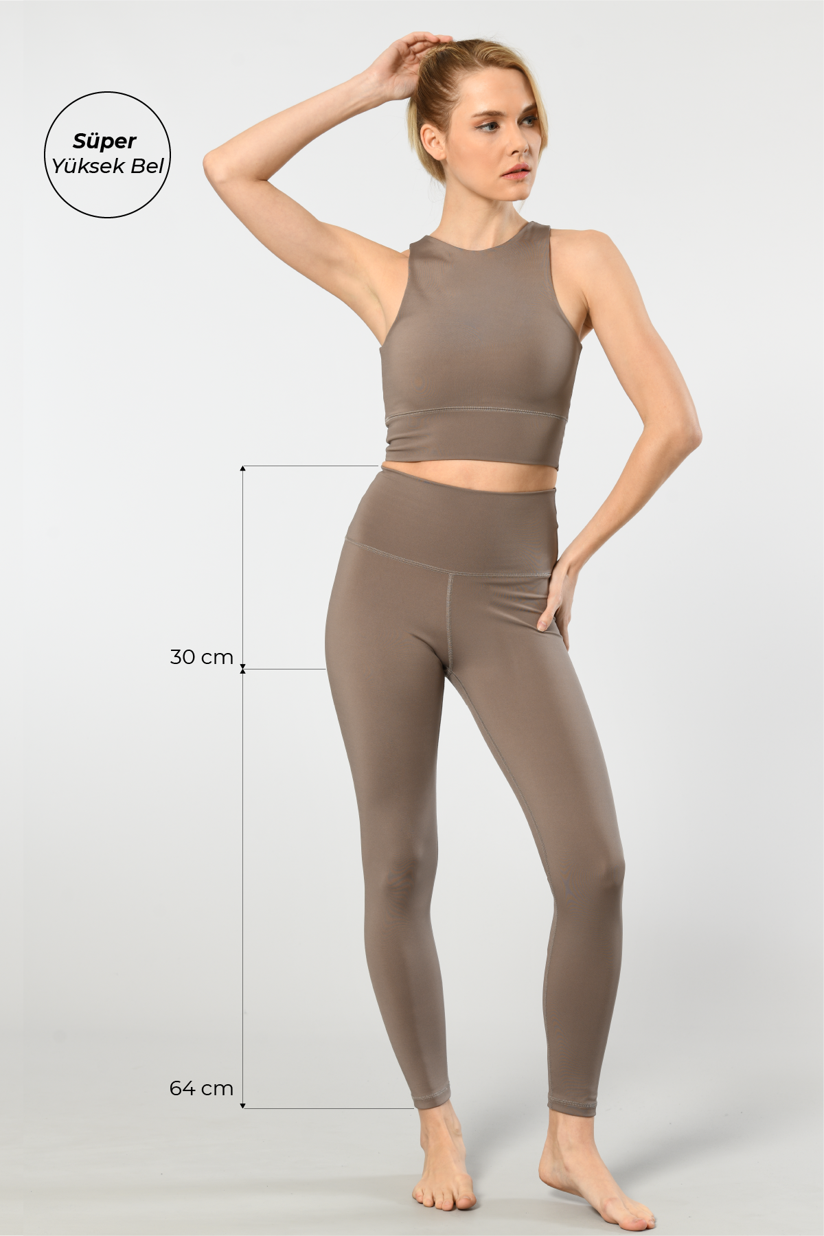 Gri tonlarında, yüksek bel kesime sahip, esnek ve hafif dokulu tayt. %80 Polyamid, %20 Elastan