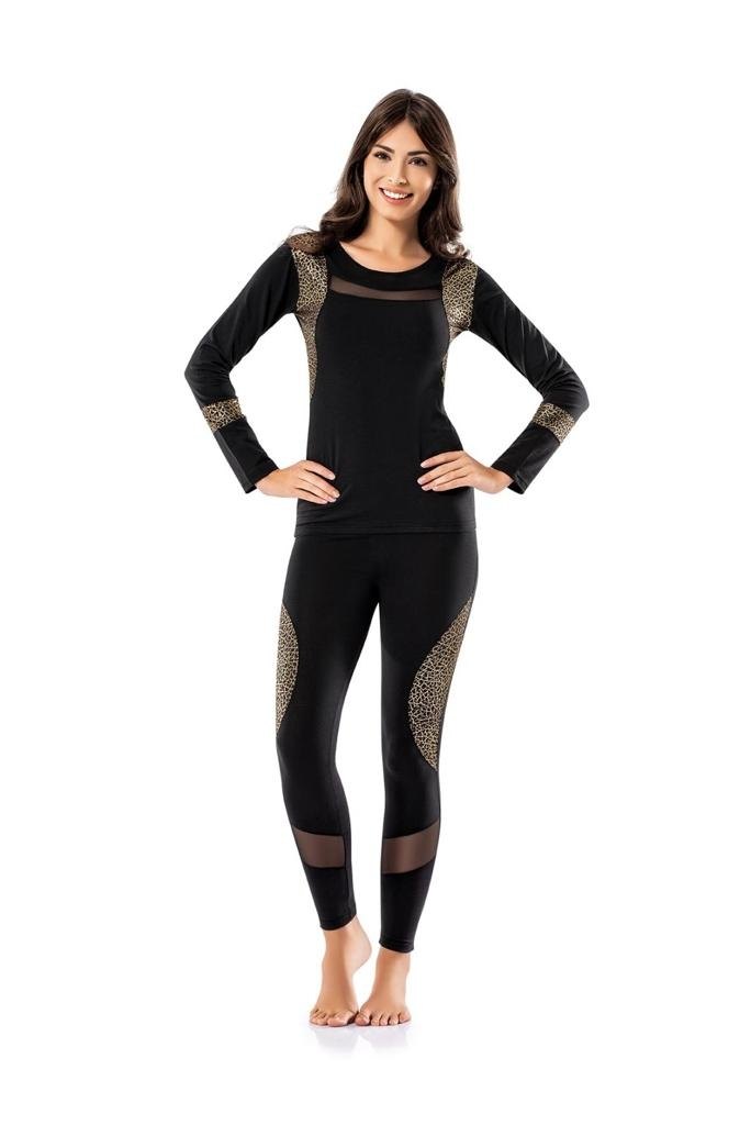 Siyah renkte, leopar detaylı, yüksek bel esnek yapılı kapri tayt takımı.