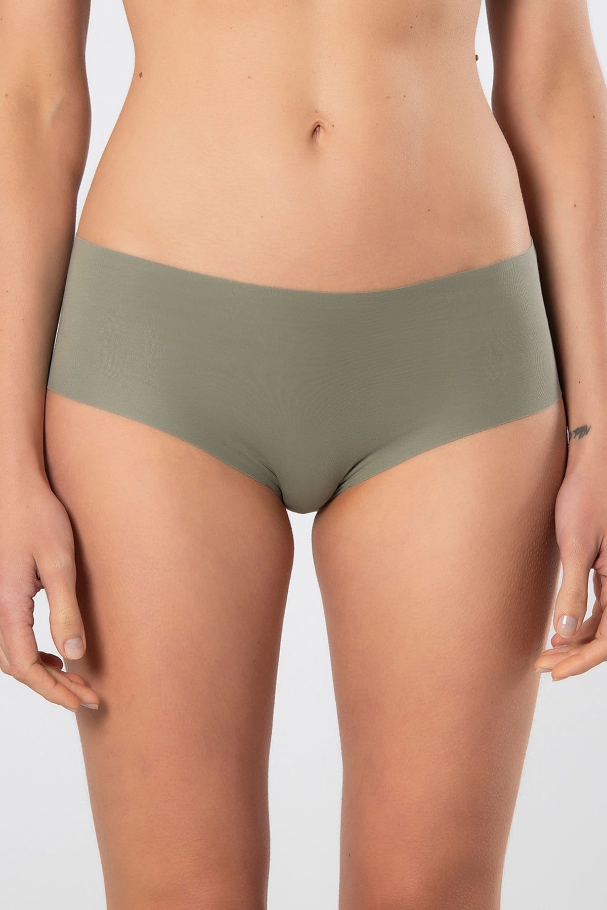 Yeşil renkte, yüksek bel kesime sahip lazer kesim pamuklu kadın külot. Yumuşak doku ve esnek yapı sunuyor. %88 Supima Pamuk, %12 Elastan