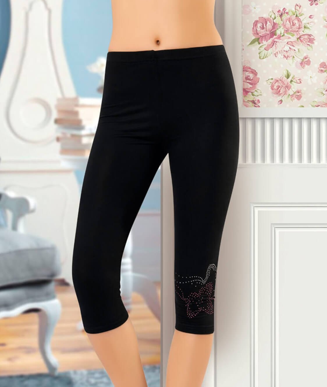 Kurşun renkli, yüksek bel tasarıma sahip nakışlı kapri tayt, esnek kumaşıyla rahat bir kullanım sunar.