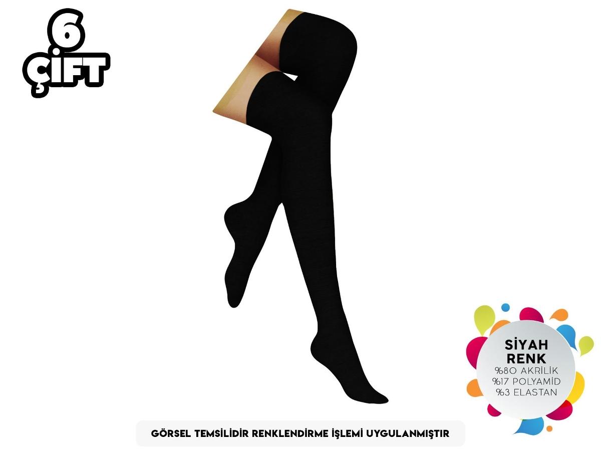 Siyah renk, dikişsiz dokuya sahip, diz üstü kesim, esnek yapısıyla konfor sunan çorap.
