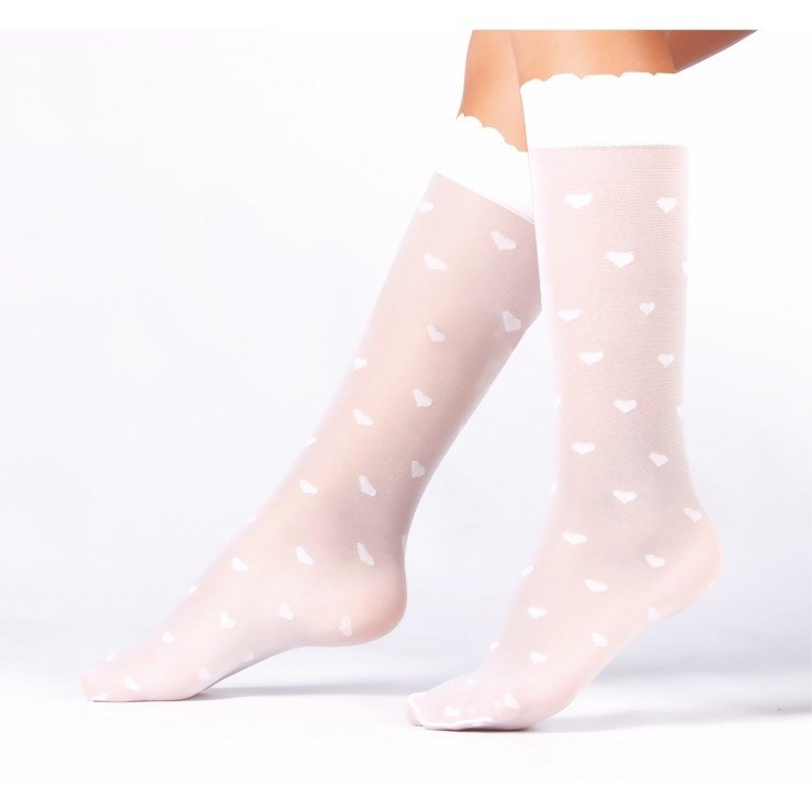 Siyah, krem, beyaz ve pembe renk seçenekleriyle, kalp desenli yumuşak dokulu çocuk dizaltı çorabı.
