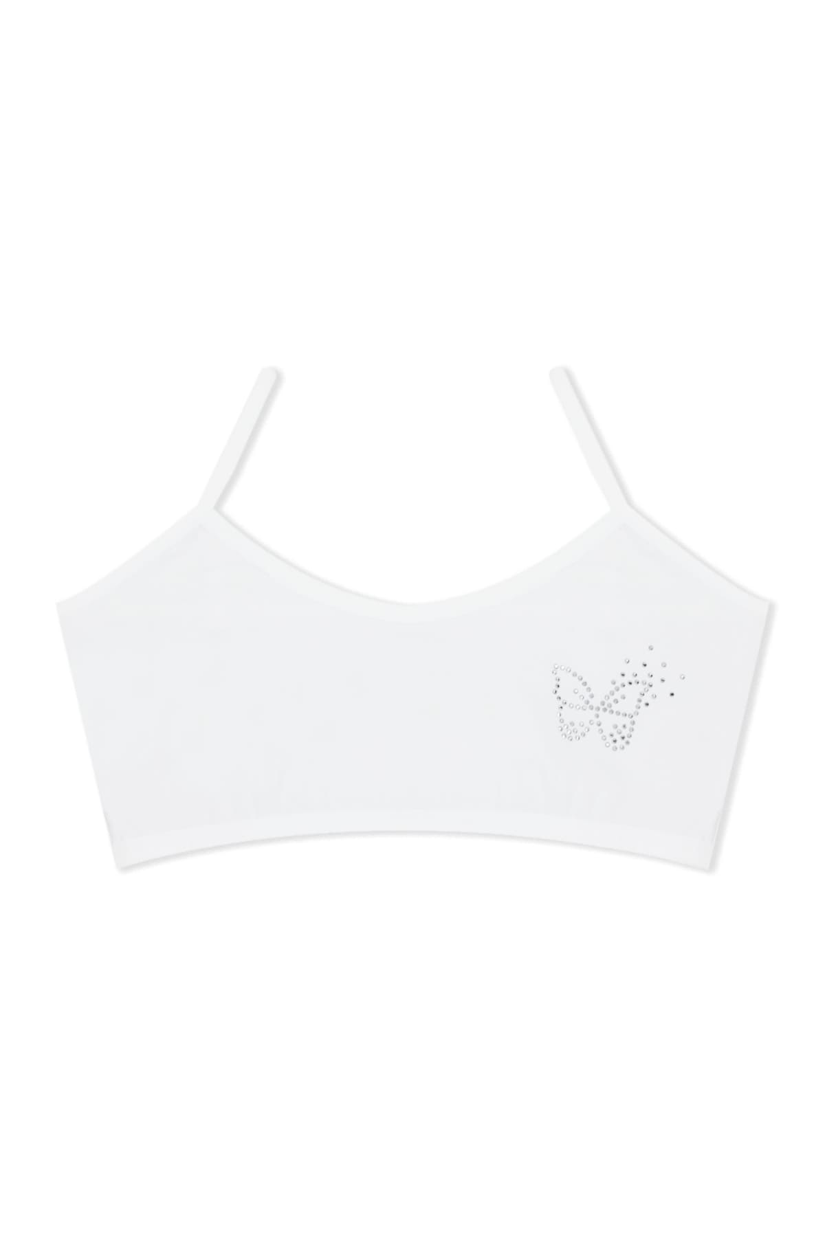Beyaz renkte, yumuşak pamuklu dokuya sahip, esnek bantlı ve balensiz tasarıma sahip büstiyer. %96 Pamuk, %4 Elastan