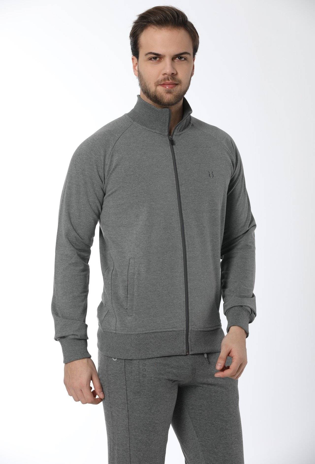 Siyah ve antrasit renkte, yumuşak penye kumaş kullanılarak tasarlanmış rahat bir eşofman üstü.