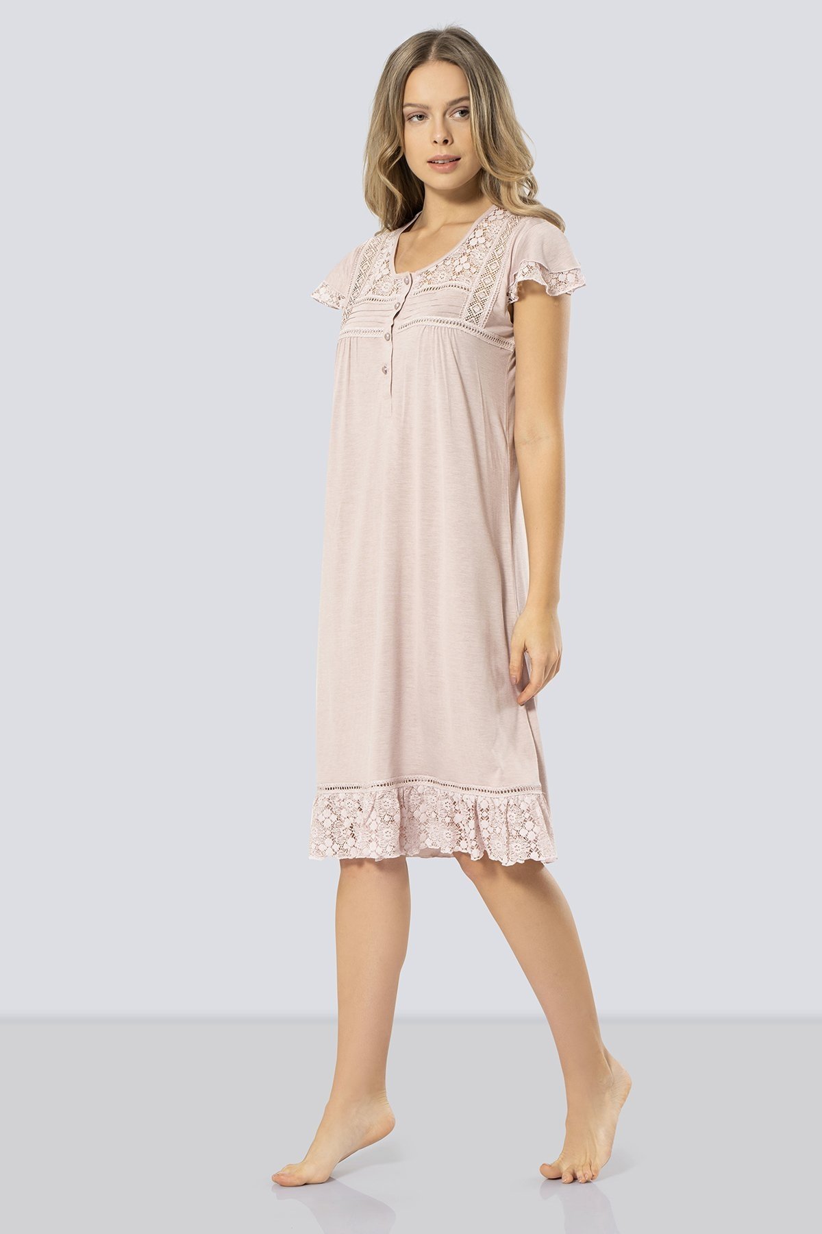 Pudra renginde, hafif ve akışkan bir dokuya sahip, uzun kesim kadın geceliği. %65 Viskon, %35 Polyester